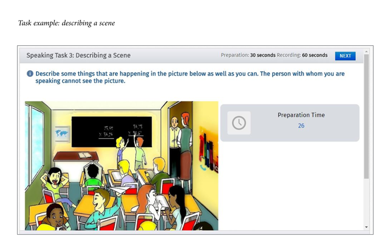 部分任务只有文字题干; 部分任务题干由文字和图片组成; 每道题目都有准备时间和作答时间; 口述内容将被录下并在考试结束后评分;